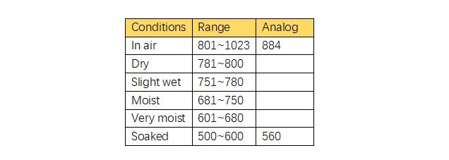 We can distinguish some of the states according to the analog value. With 10 pcs soil moisture sensor, we get the typical output, for your alarm reference.