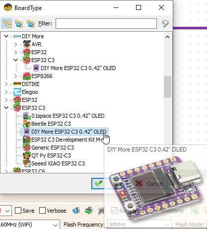 Note: there are a few different ESP32 C3 OLED boards to choose, make sure that you select the one that fits your board