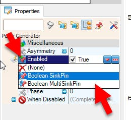 - Select "PulseGenerator1" and in the properties window select "Enabled" and click on the pin icon and select "Boolean SinkPin"