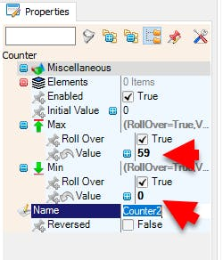 - Select "Counter2" and in the properties window set "Max" > "Value" to 59 and "Min">"Value" to 0