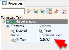 - Select "FormattedText1" and in the properties window set "Text" to %0:%1