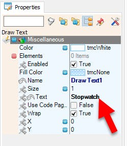 - "In the Elements Dialog drag "Draw Text" from the right side to the left and in the properties window set "Text" to Stopwatch