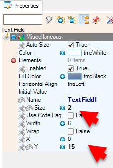 - Select "Text Field2" and in the properties window set "Y" to 15, and "Size" to 2