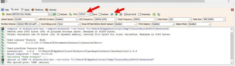 In Visuino, at the bottom click on the "Build" Tab, make sure the correct port is selected, then click on the "Compile/Build and Upload" button.
