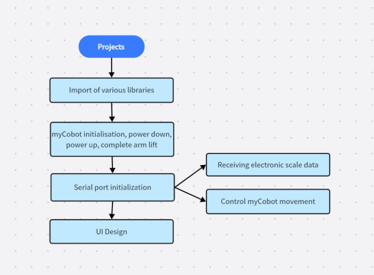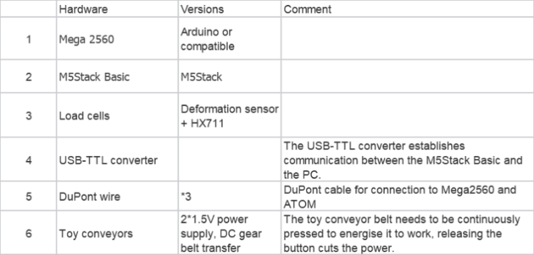 Function descriptionA small simulated industrial application was made with myCobot 280-Arduino Python API and load cells. I use the toy conveyor belt to transfer the parts to the weighing pan and use M5Stack Basic as the host to build an electronic scale to weigh the parts coming off the conveyor belt, and then transmit the weight information in the weighing pan to the PC through UART.