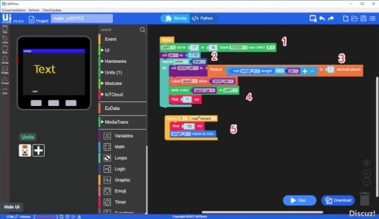 Step2:Write a weighing program and upload the program to M5Stack Basic.