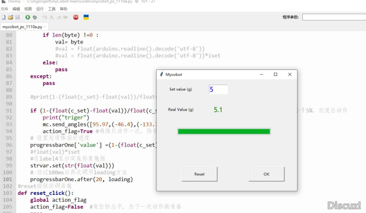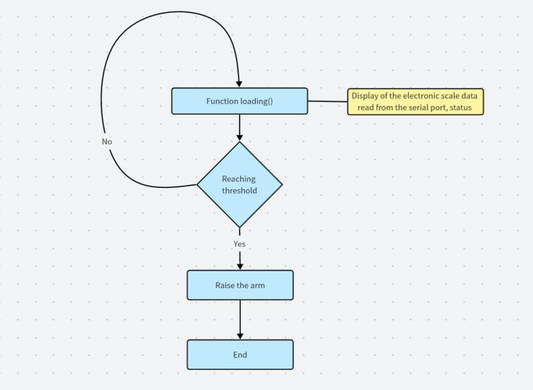 (3) A callback to the OK button first allows the myCobot drop arm to power on the conveyor, the conveyor starts working and the electronic scale monitors the weight in real time. The loding() function is responsible for reading the serial weighing data. Then determine if the threshold is reached and controlling the myCobot lift arm if the threshold is reached.