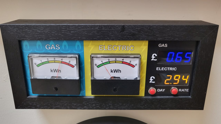 In terms of hardware, two HT16K33 driven 7 segment displays are attached as well as two 3V analog voltmeters - the scale on these has been replaced by a custom designed card which displays current real time consumption in kW for electricity, and a half hour approximation for gas consumption. Finally, two push switches swap the displays between today's consumption and the current rate being paid.