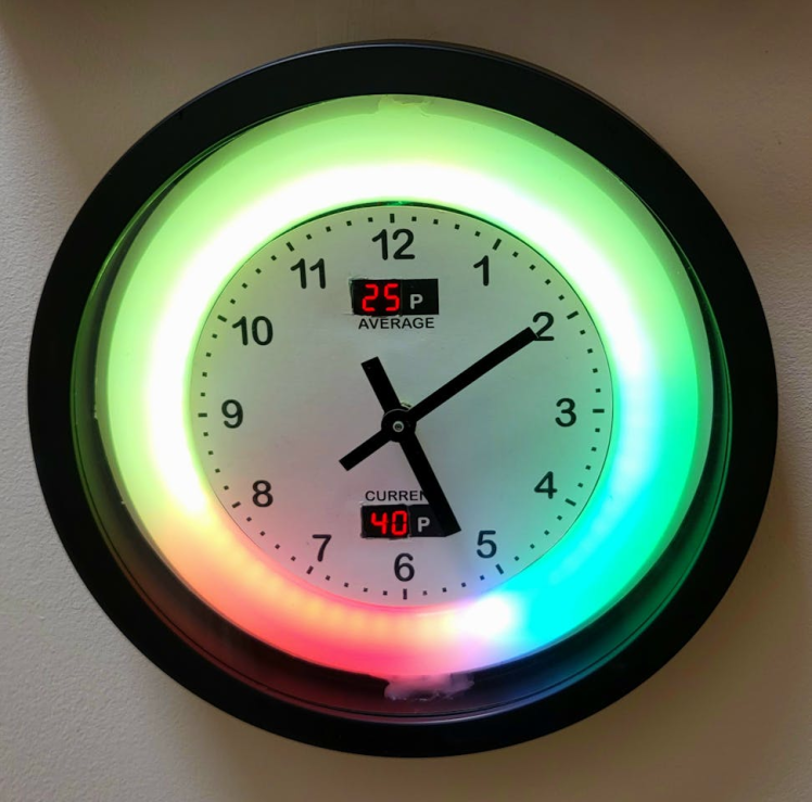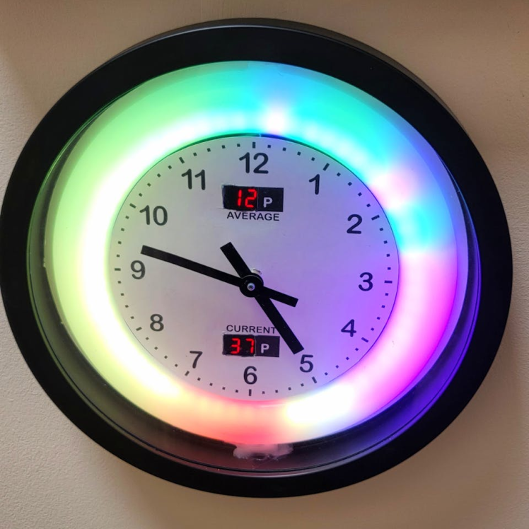 On the hardware side of things, I use a TinyPico ESP32 as a controller, a NeoPixel 60 ring for the led surround and two TM1637 7 segment displays to show the current and average rates. The hour and minute hands are driven by a regular clock mechanism - a useful way to check that the ring and actual times are in sync.