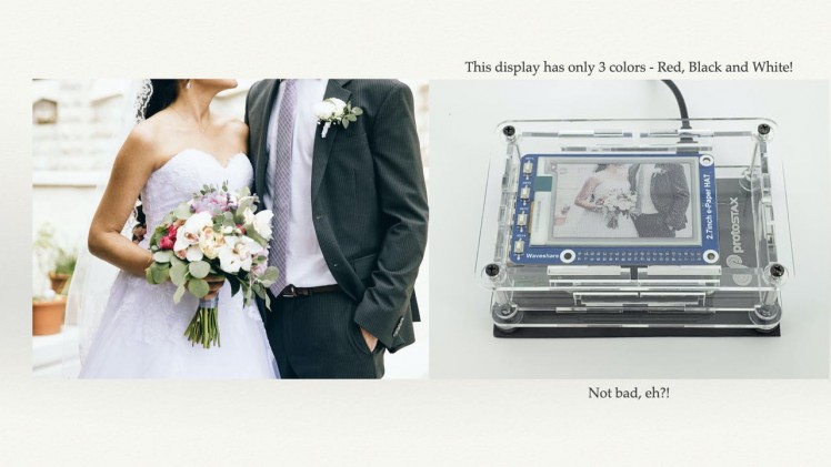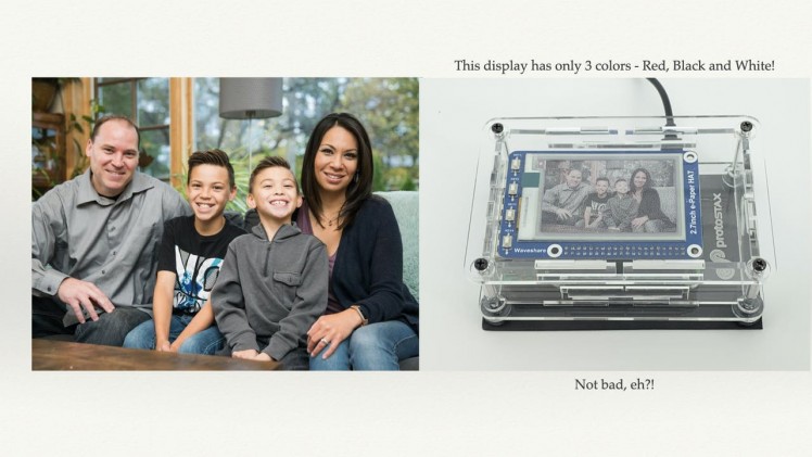 Display regular photographs on a tri-color ePaper Display. You can get pretty good image quality and color variation by using a method called Floyd-Steinberg dithering, even with only three colors (red, white and black) on the ePaper Display!