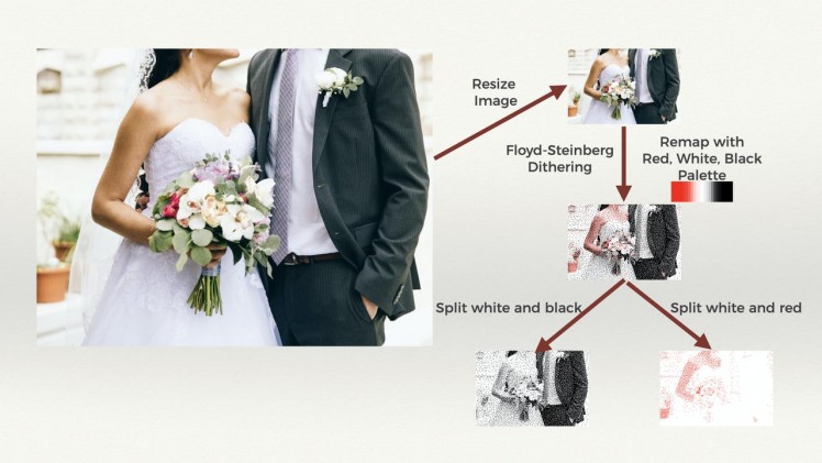 I was able to take a portrait JPG image, and with that, generate scaled-down (to 264x176 pixels suitable for the ePaper Display) Floyd-Steinberg dithered tri-color image that looked really good!! I was blown away! I later also figured out how to split the image into its component white-and-black and white-and-red portions to display on the ePaper Display as I had mentioned above.