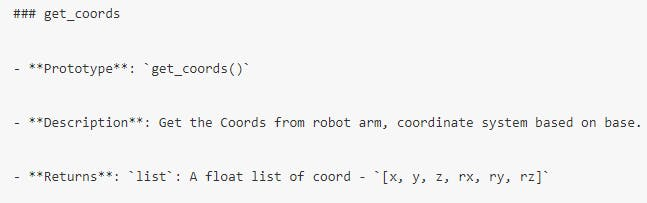 This function can get the current coordinates of the robot arm (x, y, z, rx, ry, rz)