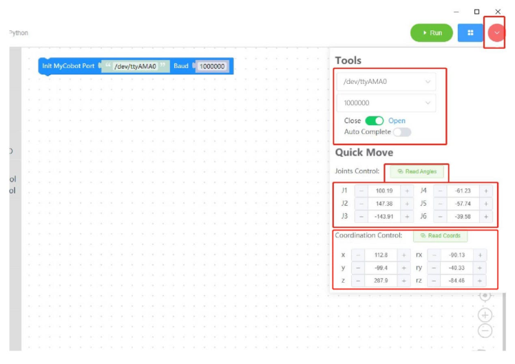 First, we shall connect myCobot to MyBlockly. Click the red button and expand the Tools view, choose the port and set the Baud rate to 1000000.