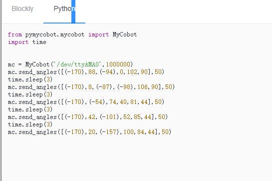 Blockly is a puzzle-style programming software based on the python environment and the pymycobot dependent library, which allows users to program and control myCobot in a building block-like method. It is especially suitable for beginners to learn programming and enhance programming thinking. Blockly also provides a python display interface, which converts the Blockly program built by the user into a python to help them learn python syntax.