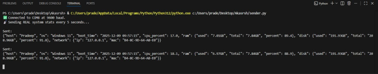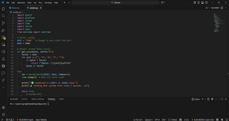 psutil. - Formats a JSON object and sends it over USB serial to the ESP32 every 5 seconds.