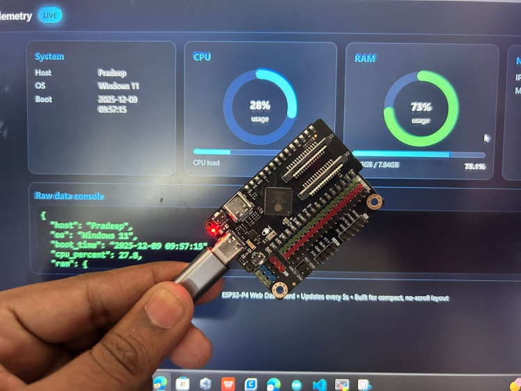 Build a real‑time system telemetry dashboard that shows your PC’s CPU, RAM, and network stats in a dark, single‑page web UI served by a DFRobot FireBeetle ESP32‑P4. Your PC sends newline‑terminated JSON over USB serial; the ESP32 parses it, blinks an onboard LED (pin 3) when new data arrives, and serves a responsive AJAX dashboard that updates every 5 seconds and includes a raw JSON console.