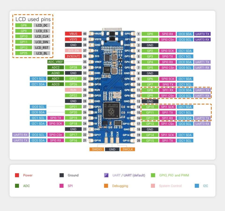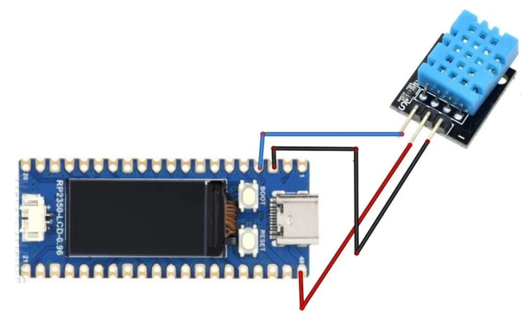 - Connect Waveshare RP2350-LCD-0.96 pin GND to DHT11 pin (GND -)