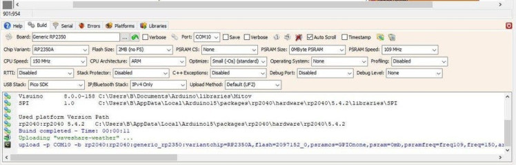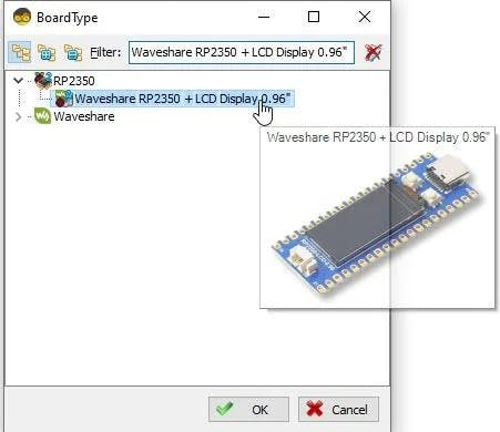 Select Waveshare RP2350 + LCD Display 0.96" and in the editor