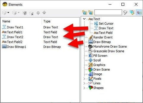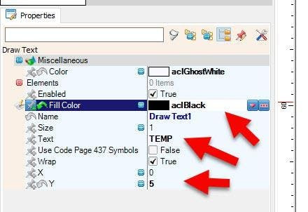 - In the Elements Dialog drag "Draw Text" from the right side to the left and in the properties window set "Fill Color" to aclBlack, "Text" to TEMP and "Y" to 5