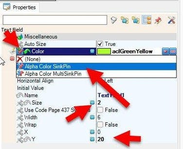 - In the Elements Dialog drag "Text Field" from the right side to the left side to the left and in the properties window set "Size" to 2, "Y" to 20, select "Color" and click on the pin Icon and select "Alpha Color SinkPin", set "Color" to aclGreenYellow