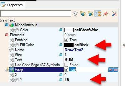 - In the Elements Dialog drag another "Draw Text" from the right side to the left and in the properties window set "Fill Color" to aclBlack, "Text" to HUM and "Y" to 45