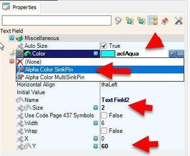 - In the Elements Dialog drag another "Text Field" from the right side to the left side to the left and in the properties window set "Size" to 2, "Y" to 60, select "Color" and click on the pin Icon and select "Alpha Color SinkPin", set "Color" to aclAqua