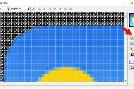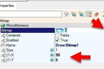 - In the Elements Dialog drag another "Draw Bitmap" from the right side to the left side to the left and in the properties window set "X" to 90 and "Y" to 5, select "Bitmap" and click on the 3 dots button and in the "Bitmap editor" load the bitmap that you attached here.