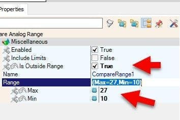- Select "CompareRange1" and in the properties window set "Is Outside Range" to True, "Range" > "Max" to 27 and "Range" > "Min" to 10