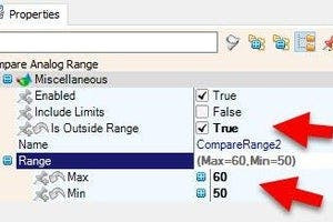- Select "CompareRange2" and in the properties window set "Is Outside Range" to True, "Range" > "Max" to 60 and "Range" > "Min" to 50