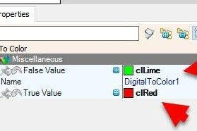 - Select "DigitalToColor1" and in the properties window set "False Value" to clLime and "True Value" to clRed
