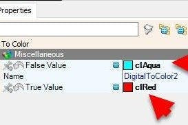 - Select "DigitalToColor2" and in the properties window set "False Value" to clAqua and "True Value" to clRed