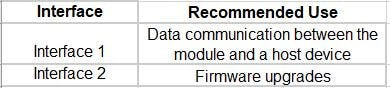 Interface 2 is typically used for firmware upgrades on the MR60BHA1 60GHz mmWave Module. Interface 1 is typically used for data communication between the module and a host device.