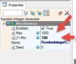 - Select "RandomIntegerGenerator1" and in the properties window set Min to 100 and Max to 1000 (Picture 6), This means that we will send random numbers betwen 100-1000