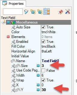 - "Text Field" to the left side and in the Properties window set "Size" to 3 and "Y" to 30