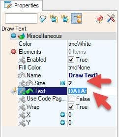 - "Draw Text" to the left side and in the Properties window set "Size" to 2 and "Text" to Data: