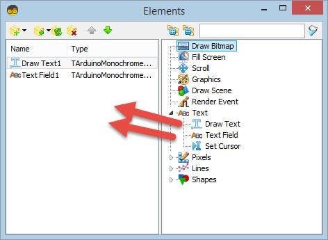 Double click on the "DisplayOLED1" and in the "Elements" window drag: