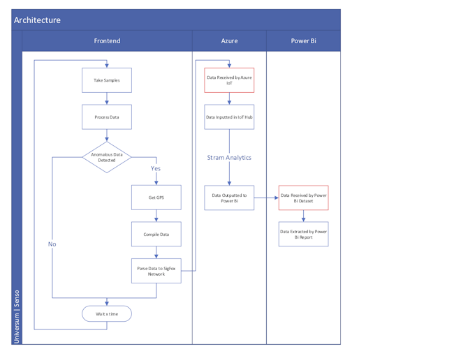 The product is split into a frontend and a backend. The frontend consists of the device on the field taking samples and the backend consists of the SigFox, Azure and Power Bi ends which process and display the data. Below is a diagram illustrating the process.