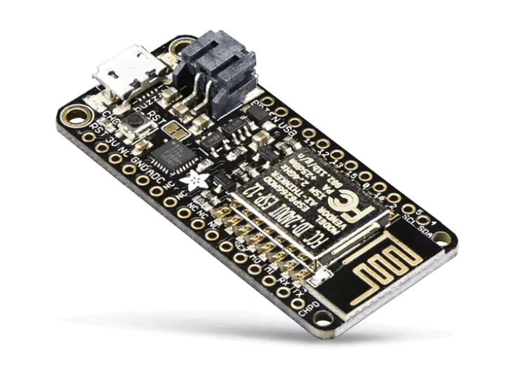 The Huzzah has an operating voltage of 3.3V, but when powered via USB, it is possible to tap into the USB’s 5V via the V_USB pin. This allows us to power the 5V servo motor without a separate supply. The Pulse Width Modulated (PWM) signal wire of the servo can remain at 3.3V.