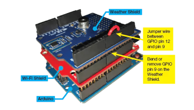 For this particular project, both the WRL-13287 Wi-Fi Shield and the TE Connectivity Weather Shield have hardwired GPIO pin D9 for their own needs. For the Wi-Fi shield, pin 9 is being used as the TX pin for the software-based serial port that connects the development board to the ESP8266 SoC. On the weather shield, the same pin is part of a chip select multiplexer design along with pins 10 and 11.