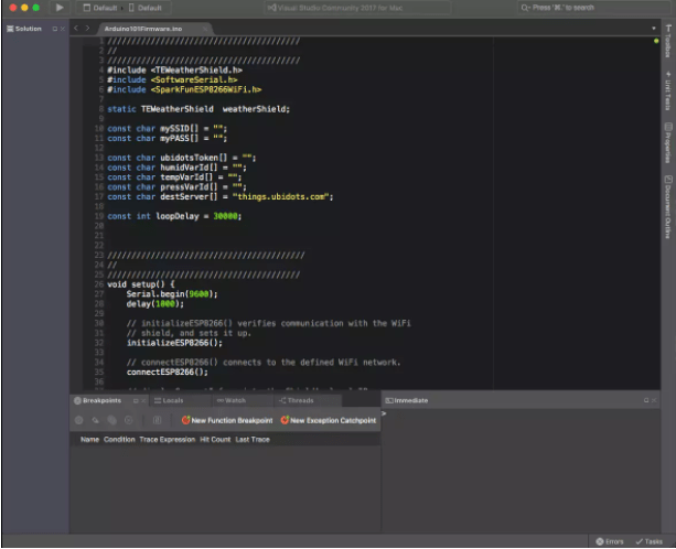 The software for this project was developed using Microsoft’s Visual Studio Code, an extensible code editor that supports a variety of languages including C/C++ and the derivative wiring language used in the Arduino IDE (Figure 6). Visual Studio Code offers more robust development features such as code completion and breakpoints. However, this project can be accomplished just as easily in the standard Arduino Integrated Development Environment (IDE) if so desired.