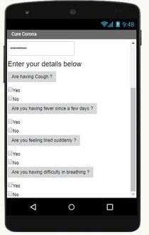 We have also developed an app (CoronaSecure) using MIT App Developer in which we will take up a survey of the person in whose's arm the device has been attached.The person will have to fill up a survey containing some questions about the common symptoms [as adviced by WHO] of COVID-19 virus, such as the picture below.