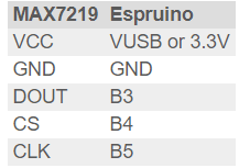 MAX7219 32x8 Pixel LED display MAX7219 32x8 Pixel LED display http://www.espruino.com/MAX7219 x 1