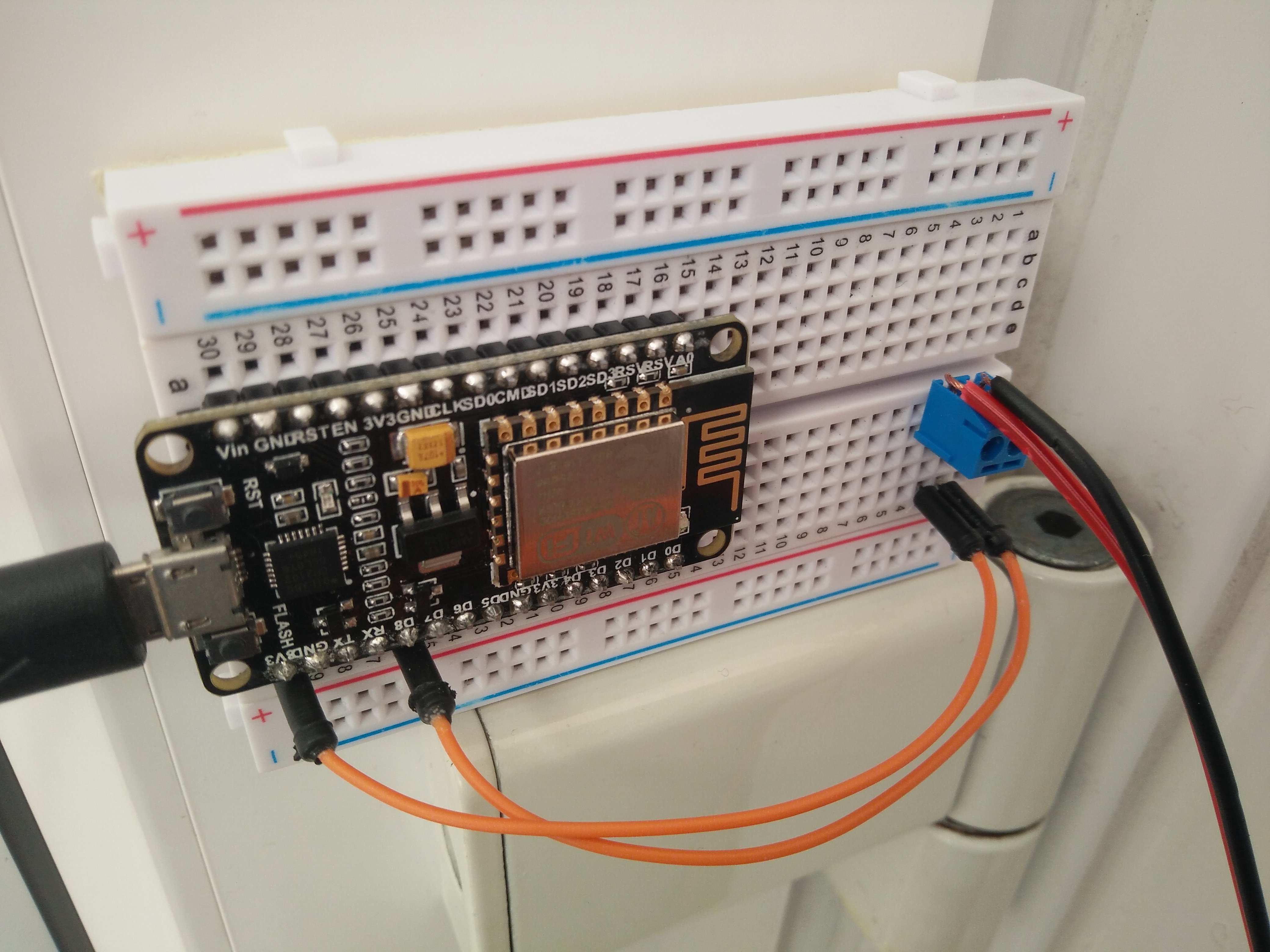 The hardware build for this project is incredibly simple. We only need a reed switch to connect to our NodeMCU board. So insert the NodeMCU board into the breadboard, and then insert the reed switch into the breadboard as per the diagram. Then using the jumper wires connect one side of the reed switch to D8 (Pin 15 in Mongoose OS) and the other side of the reed switch connects to 3V3.